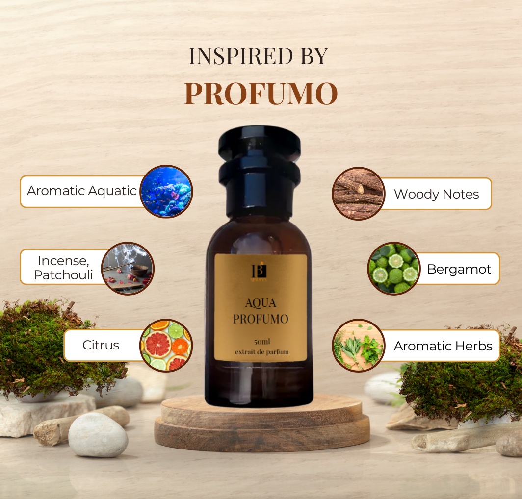 Immerse yourself in the essence of the ocean with 'Aqua Profumo,' an extrait de parfum inspired by Profumo.  captures the purity and depth of the sea. The scent opens with a fresh surge of sea notes and bergamot, invoking the crisp ocean breeze. It transitions into a herbaceous heart of rosemary, sage, and geranium, blending aromatic finesse with subtle spice. The journey concludes on a profound base of incense and patchouli, adding an earthy, smoky finish that enhances its sophisticated complexity. Housed in a sleek bottle, 'Aqua Profumo' is perfect for the modern man who carries the spirit of the sea within him.