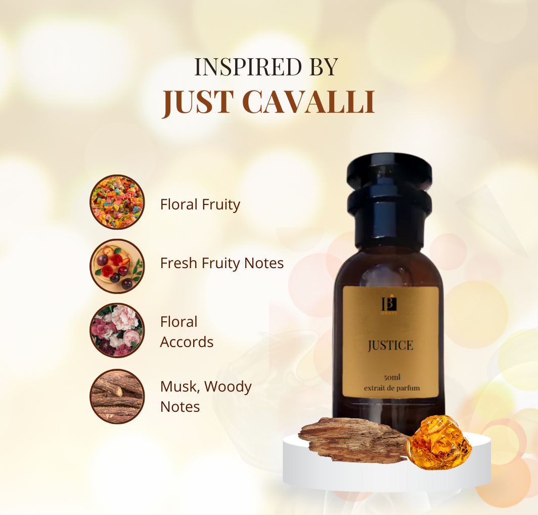 Inspired by Just Cavalli, Justiceis a vibrant and playful Floral Fruity fragrance for women. This extrait de parfum opens with fresh and juicy top notes, evoking a sense of youthful energy. The heart reveals a bouquet of delicate floral notes, while the base adds a warm, sensual finish with hints of musk and woody accords.