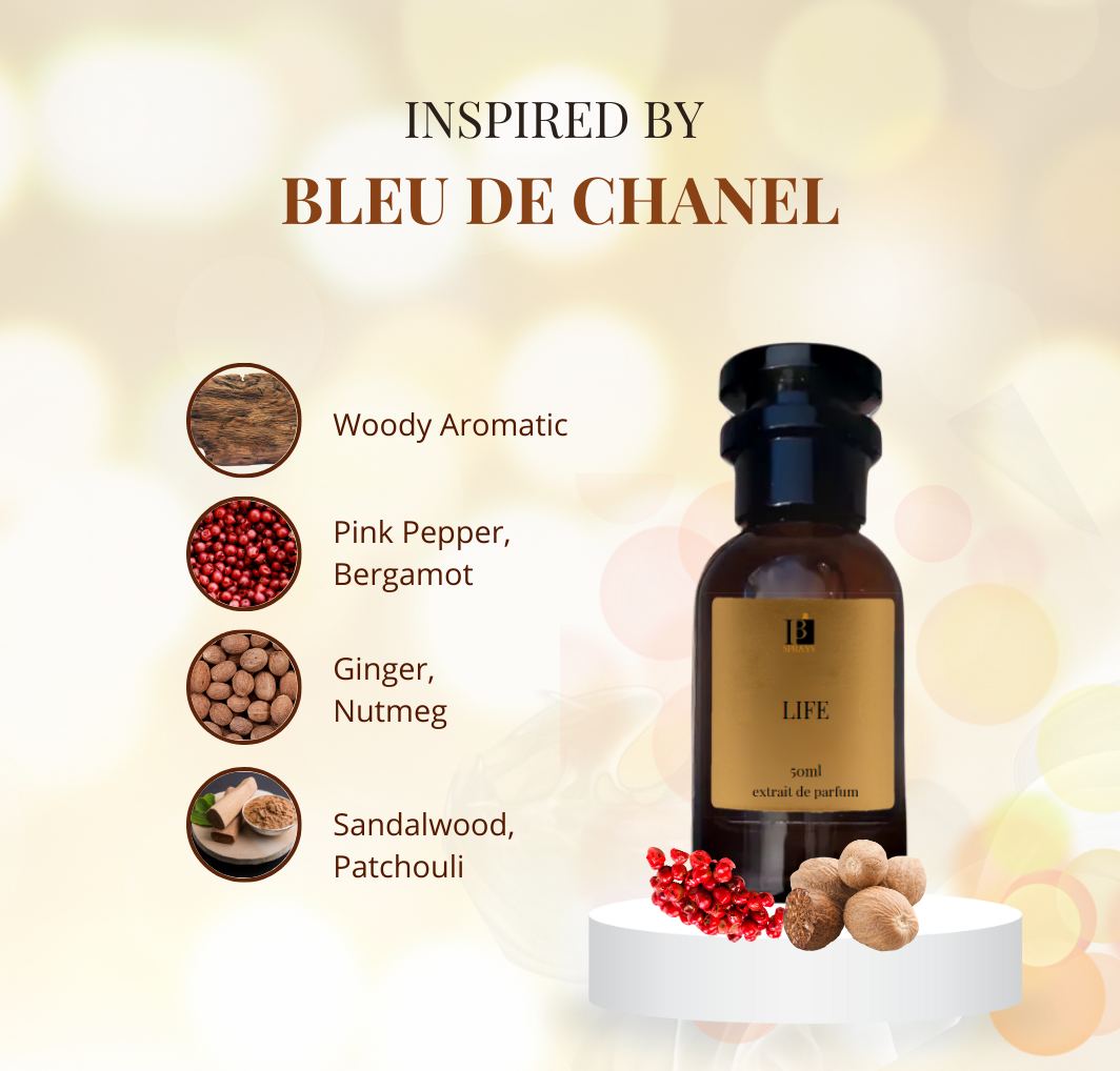 Inspired by Bleu de Chanel, Lifeis a sophisticated Woody Aromatic fragrance for men. This extrait de parfum opens with fresh and zesty top notes of grapefruit, lemon, mint, pink pepper, and bergamot, complemented by aldehydes and coriander. The heart features a spicy blend of ginger, nutmeg, jasmine, and melon. The base is a warm and sensual mix of incense, amber, cedar, sandalwood, patchouli, amberwood, and labdanum, creating a deeply alluring scent.